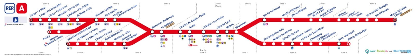 We decided to get the train into Paris from Marne-la-Vallée/Chessy, which is situated 60 seconds from the main gates to Disney. The line we used was the RER A (RER = Région Express Railway). You can see on the map below that we went from Marne-la-Vallée/Chessy (top right) to zone 1 Gare De Lyon.